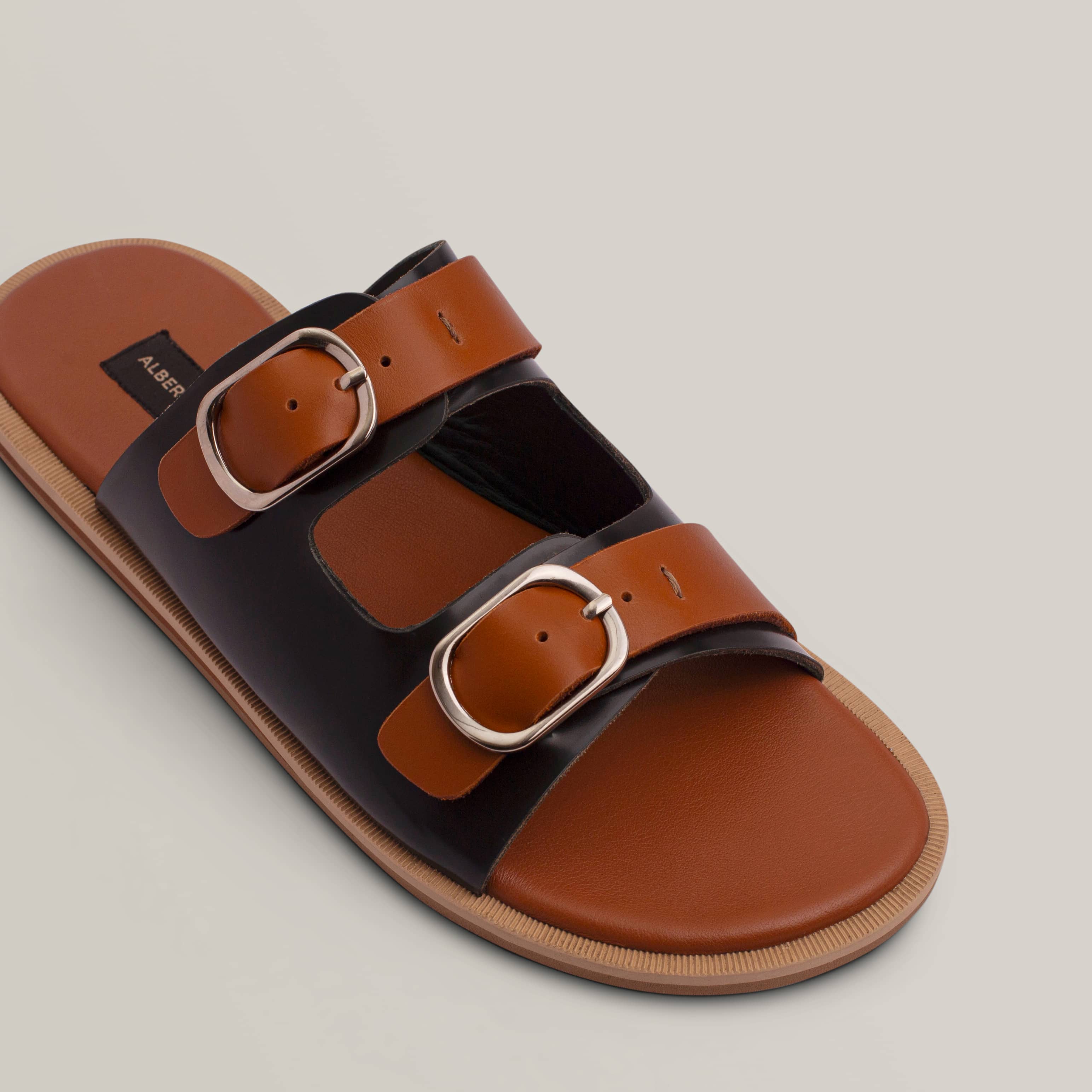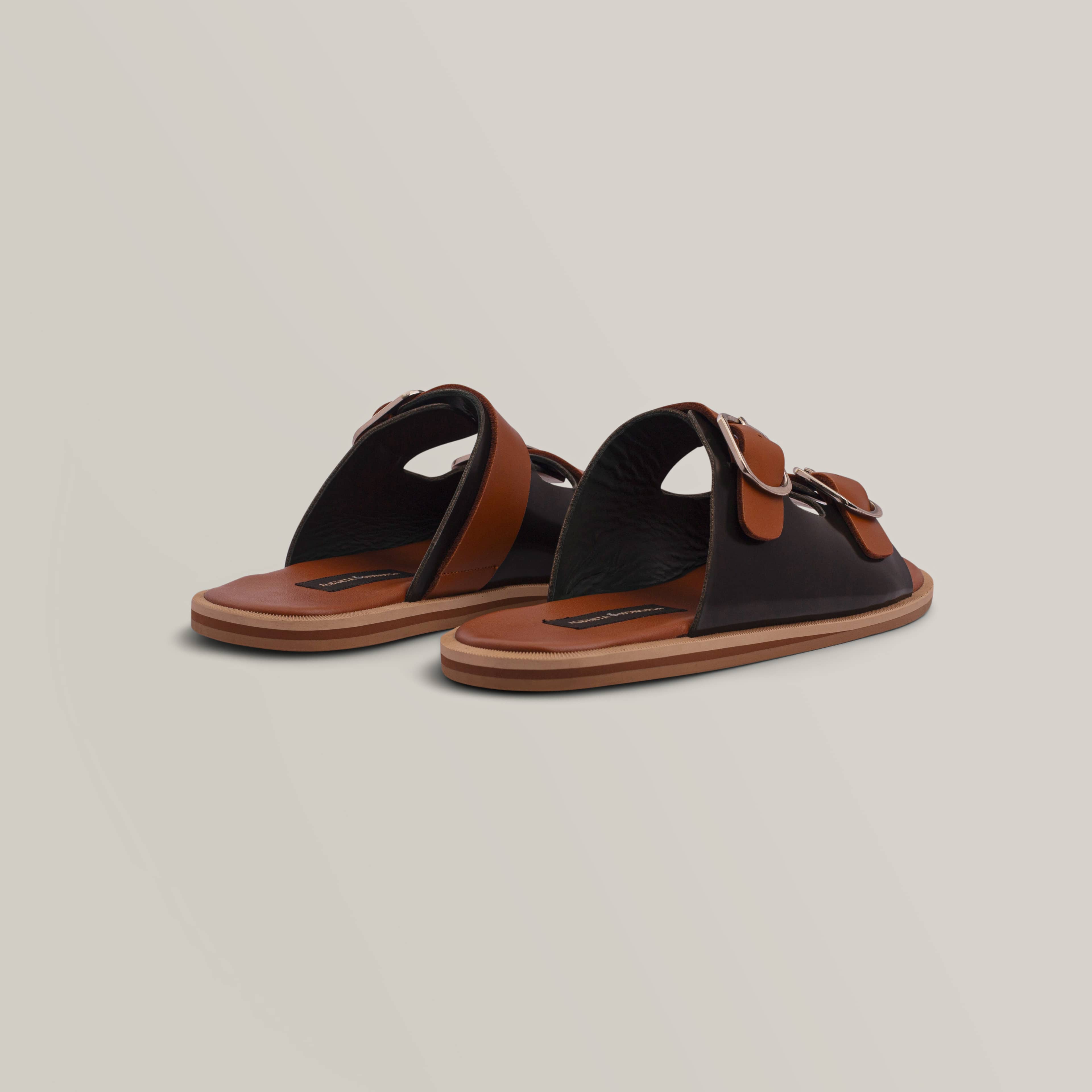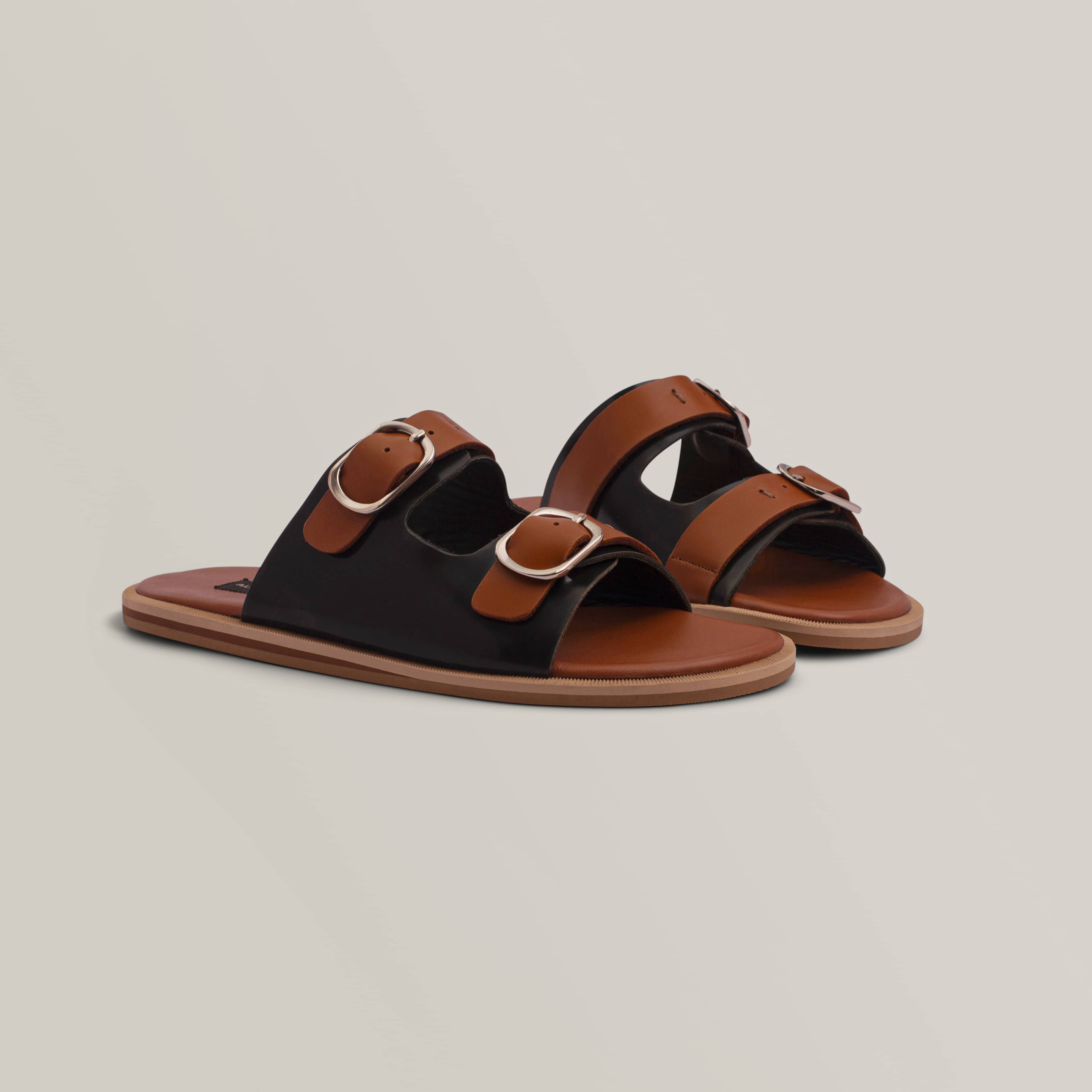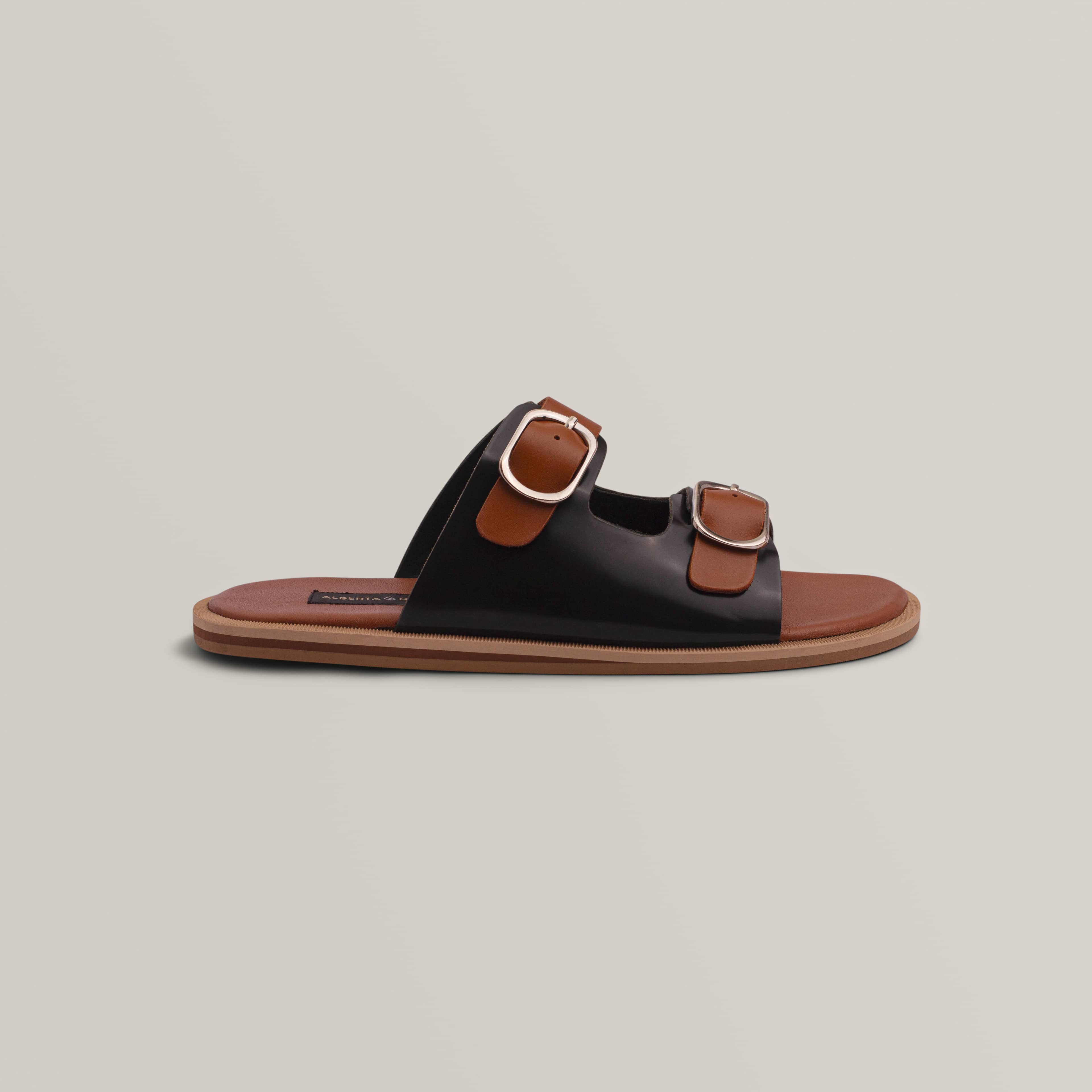 The Olowu unfolds as a quiet symphony of form and detail. Dual horizontal straps secured with polished silver buckles meet a two-tone interplay of individually layered straps, each element composed to work in measured harmony. The interior is fully lined in supple calfskin, settling into a leather-wrapped multilayered insole that offers discreet comfort. A ridged welt and concealed metal shank provide architectural support, layered with a cushioned Marco-EVA midsole and grounded by an anti-slip TPU crepe sole.